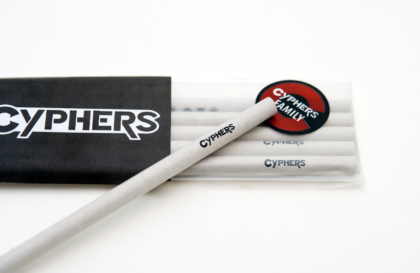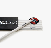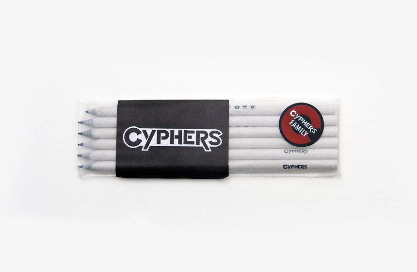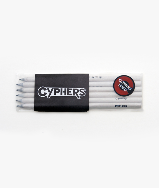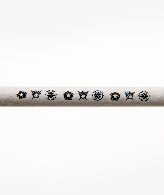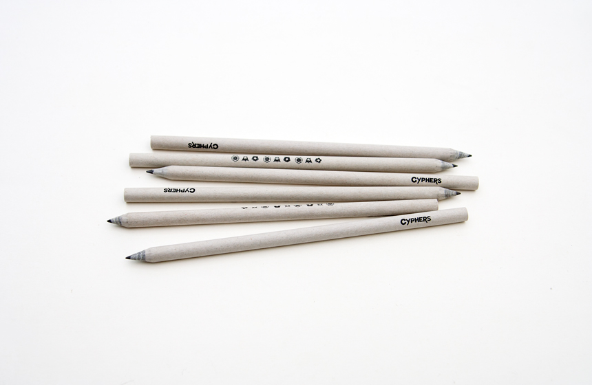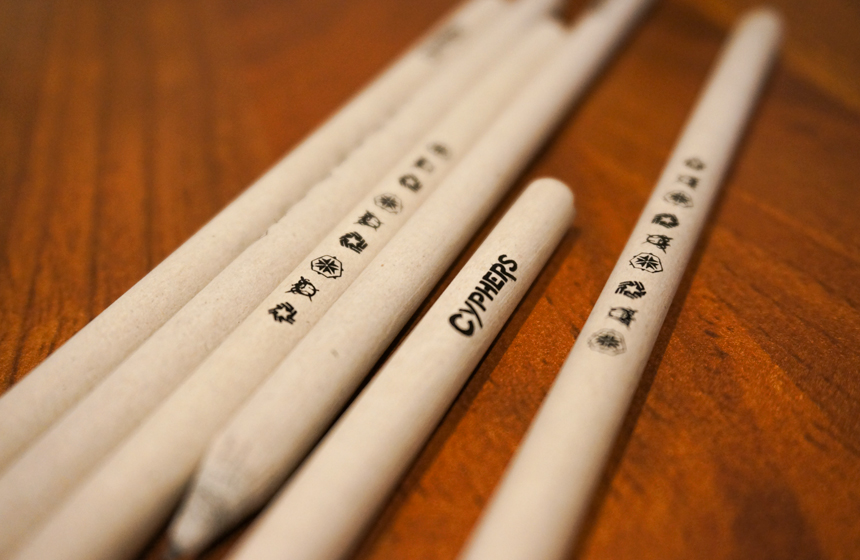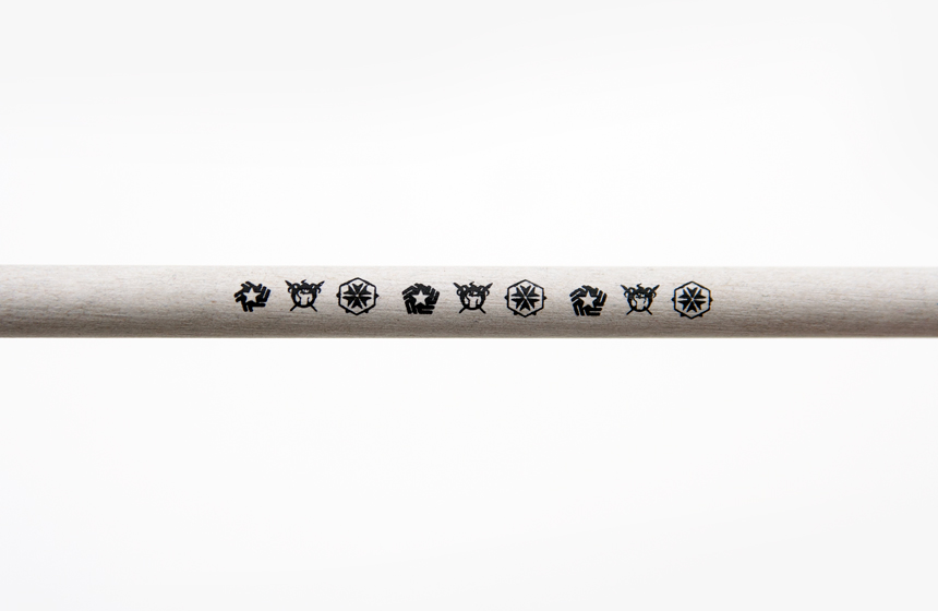 몸체에 저스티스 리그, 지하연합, 헬리오스의 심벌과 사이퍼즈 로고가 그려진 심플한 디자인의 연필입니다.